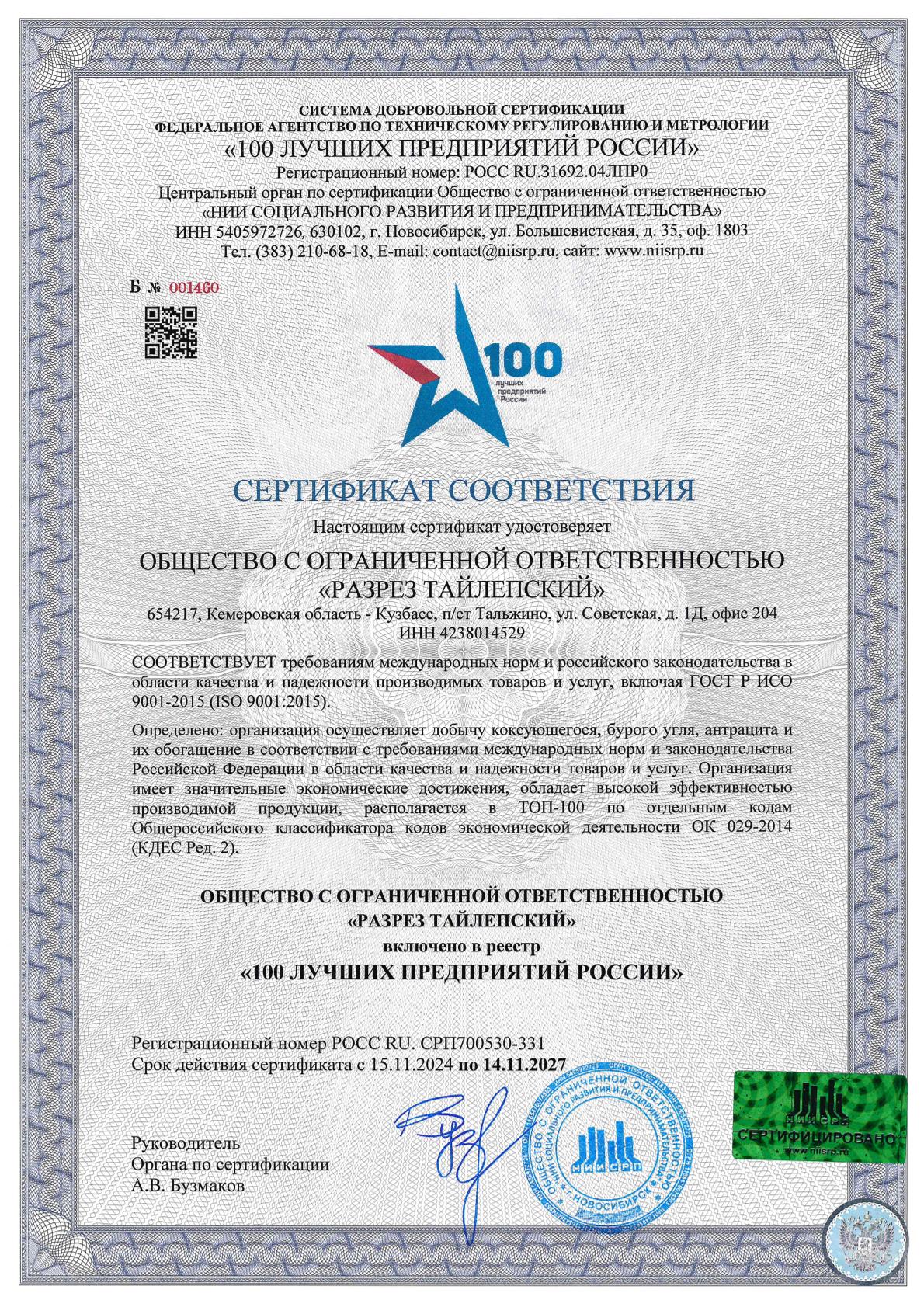 654066, Кемеровская область – Кузбасс, г.Новокузнецк, улица Тольятти, здание 9Б, корпус 1, 8 этаж, оф.812